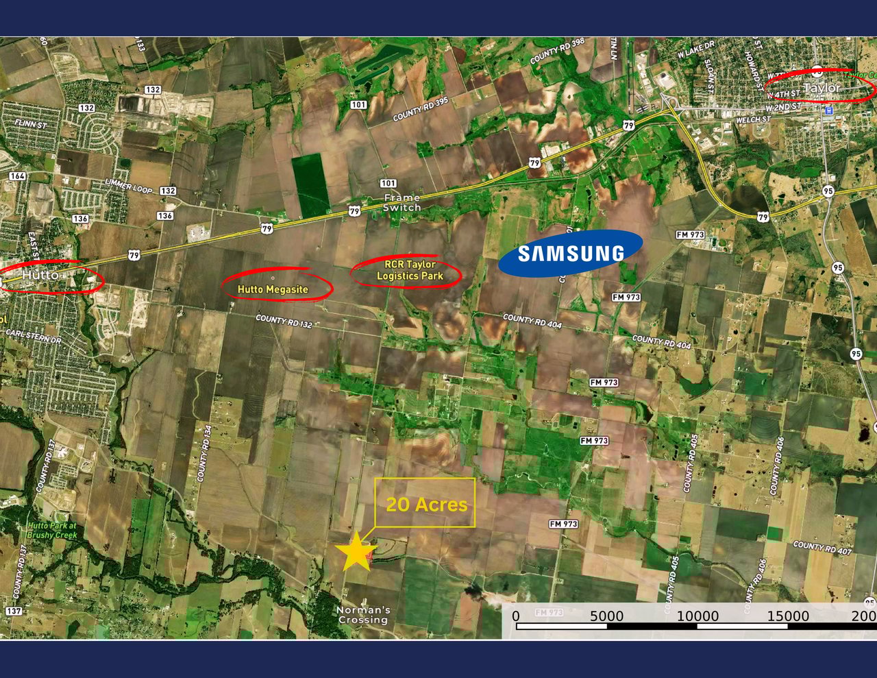 Just five minutes from Samsung, this 272-acre tract is positioned at the corner of FM 973 and FM 1660 in the path of Taylor’s next wave of growth. Offering 2,000+ feet of frontage, dual access, level topography, no FEMA floodplain, available water, nearby wastewater, and Opportunity Zone status, the property sits within the Taylor ETJ and ISD and is well suited for master-planned or phased residential development amid one of Central Texas’s fastest-growing corridors.